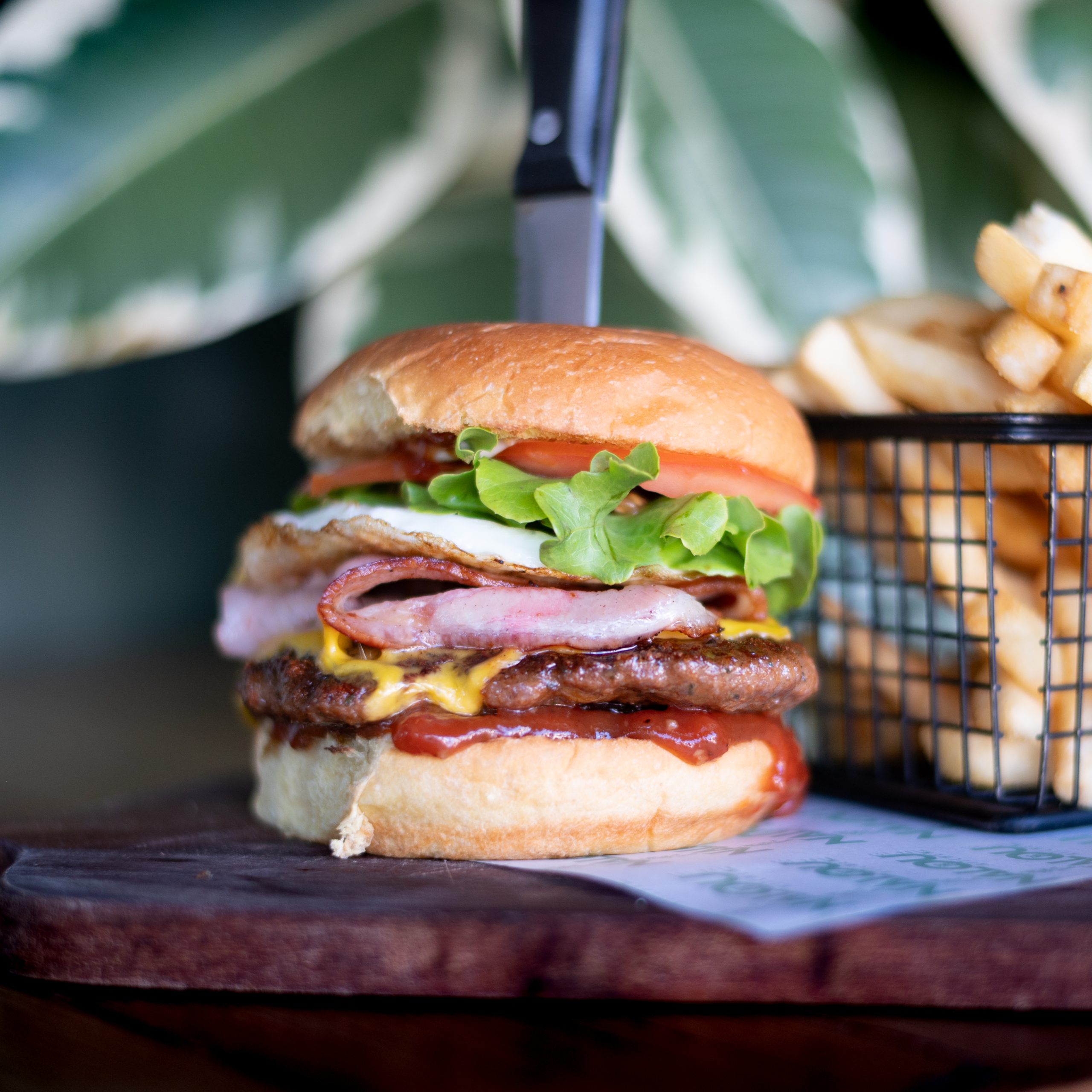 Beef Pattie, American Cheese, Lettuce, Tomato, Beetroot, Egg, Bacon, Tomato Relish, Bbq Sauce, Aioli